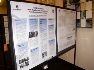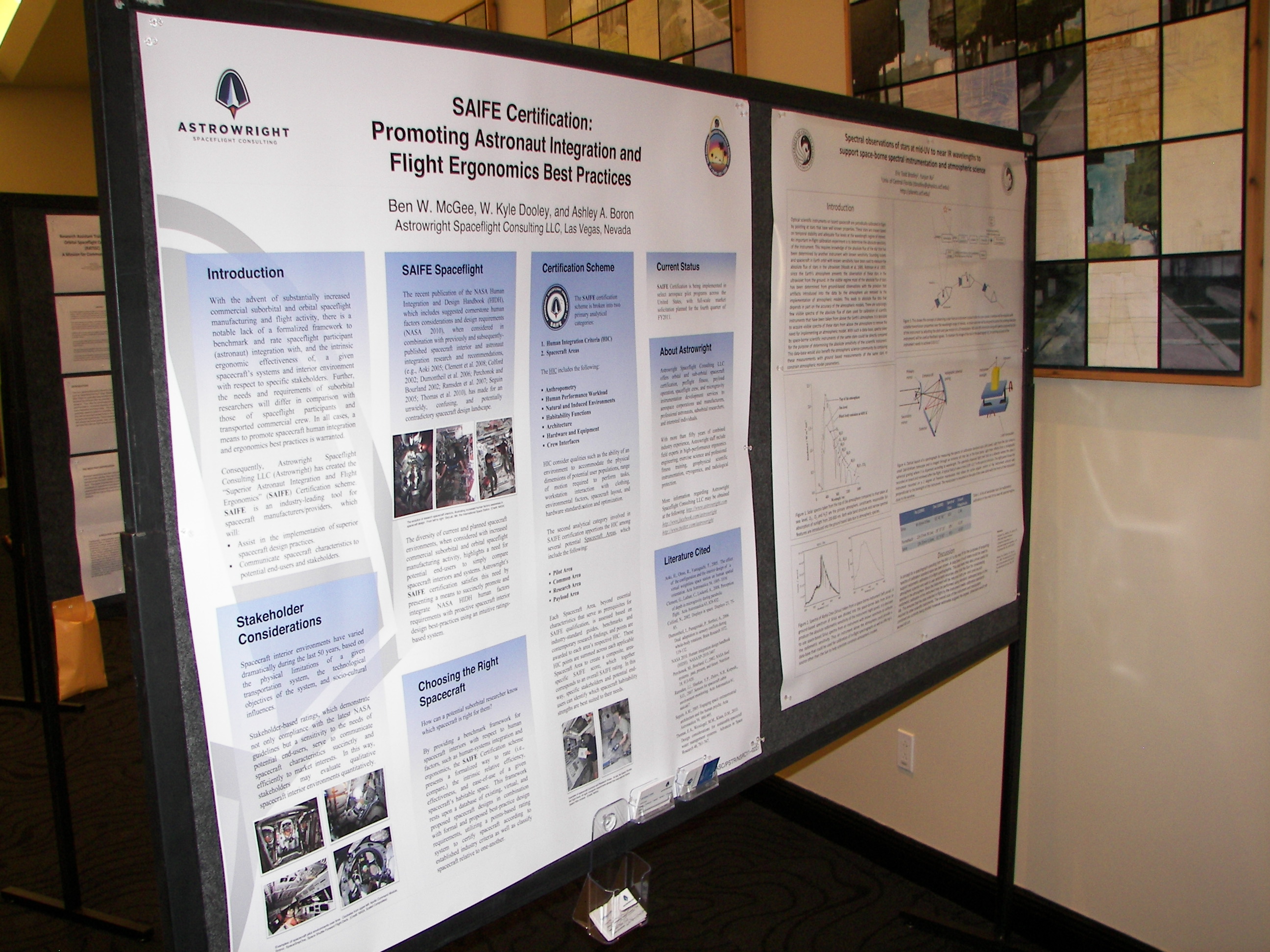 This year, Astrowright staff presented the overview and rating scheme for our Superior Astronaut Integration and Flight Ergonomics (SAIFE) Certification to conference attendees, which included both spacecraft end-users (researchers) as well as spacecraft manufacturers and providers. The most notable spacecraft provider exchanges were made with the organizations Rocketplane Global and XCOR Aerospace. General reception of the SAIFE Certification scheme was overwhelmingly positive, and the experience provided invaluable user and provider feedback, leading to immediate and specific process and service improvements. (This in-and-of itself was a significant ROI on what was a very reasonable registration cost for conference attendance. Based on this experience, it is our subsequent belief that the impact of participation at future NSRC meetings can not be underestimated.)